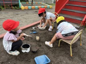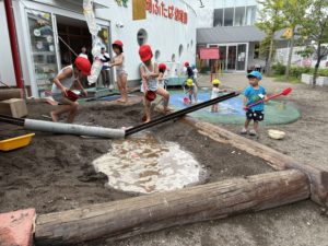 今日は雨が降る天気予報でしたが、午前中は曇り空で蒸し暑い一日でした。空とにらめっこをしていた子ども達から「お外で遊びたい!」「泥んこ遊びをしようよ!」と提案があり、早速園庭にレッツゴー!!砂場に水を溜めてスコップや塩ビ管で水路を作って水の流れを観察したり、「うわ~!」と歓声を上げてシャワーから出てくる水の心地よさを感じていました★中には衣服を脱いで”元気出るふたば池”に入り、頭から水を被ったり、泥んこ遊びに展開するなどダイナミックに遊んでいる子ども達は逞しいな…と感心しました(笑)。これからもお天気や気温に合わせて様々な遊びが楽しめるよう計画していきたいと思います!