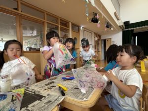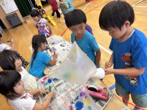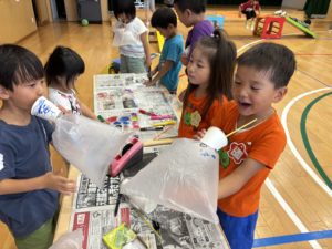 今日は午前中雨が降っていたので運動場で遊びました。コーナー遊びでは「風船作り」をすることに!ポリ袋に好きな絵を描き、ストローで膨らませると自分だけの風船が出来上がります✨🎈製作を進めていくうちに「お祭りに売っているわたあめみたいじゃない?」と発見をしたり、空気が漏れると膨らまないので「破れているところはないかな?」と丁寧に作ったりと完成へのイメージを膨らませながらオリジナルの風船を作ることを楽しんでいました(*^^*) 「お父さん、お母さんの分も作る!」と張り切って2個目を作っている子も多くプレゼントをして喜ばせたいという思いやりの気持ちが感じられました☆彡いよいよ夏休みは明日で終わります。最終日のホームフレンドサークルもたくさんの子ども達に会えることを楽しみにお待ちしております!