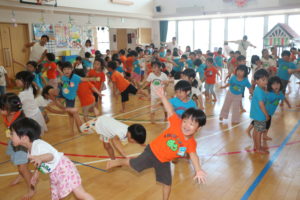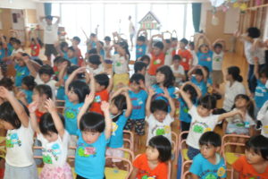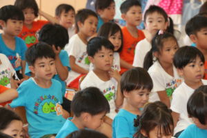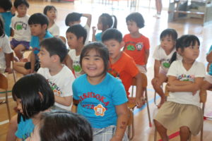 今日は第2学期始業日集会でした。「また会えて嬉しいね!」と言葉を交わしたり「○○して遊ぼうよ!」と友達同士で誘い合う姿があり、久しぶりの再会を喜び、楽しみにしていたのだな…と伝わってきました。集会の中では、2学期の活動や新しくなった朝・帰りのうた、体操を知り、興味津々の子ども達。『ヤッホホー』の曲が流れると、「あっ、知ってる!」と盛り上がっていました