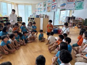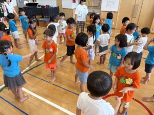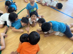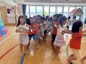 今日は年中組と年長組が合同で一日過ごし、たくさんの友達とスキンシップをとって楽しめるように運動場でムーブメント活動を行いました。各クラスで人気のうた遊びを取り入れると「楽しいね!」「次何作る?」と相談したり、楽しいという気持ちを共有しながら取り組んでいました!(^^)!その後は、ちゅうりっぷ組とすみれ組・たんぽぽ組とひまわり組でクラスを分け、教室で〈夏休みの思い出を伝え合う会〉を行いました。年中組の子ども達は、少しドキドキしながらも自分の思い出を言葉や身体で伝えることを楽しみ、年長組の子ども達が「へぇ!いいね!」「誰と行ったの?」など自然と質問をしてくれたことで温かい雰囲気で言葉のやりとりを育むことができたと感じます。お弁当も一緒に食べ、新しい友達ができたことや普段と違う環境に新鮮さを感じながら一日過ごした子ども達!今後も他学年との交流を楽しめるように計画していきたいです😊