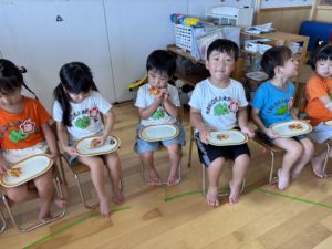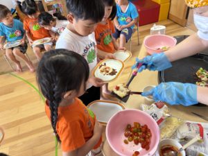 年中組の栽培活動で大切に育てたミニトマトとピーマンを収穫し、今日は『ピザ』を作って食べました。担任がミニトマトとピーマンを切ると、野菜の断面を見て「ワ~っ!」と大興奮の子ども達!今回は餃子の皮の上に2種類の具材とチーズを乗せてホットプレートで焼いて待つこと6分。「段々いい匂いがしてきた!」「幼稚園でピザが作れるなんて嬉しい!」と期待いっぱいでした。そして、実際に食べた時には、「美味しいからちょっとずつ…」と言って少しずつ食べたり、「もっと大きいピザを作りたい!」など感想を話していました☆「簡単だからお家でも作ってみたい!」と意欲満々!ピザ職人がたくさん誕生した瞬間でした(笑)。