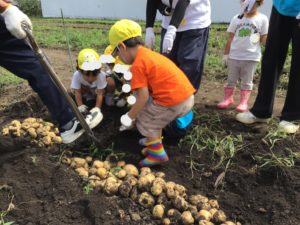 ひよこ組でじゃがいも掘り体験をしました!行きのバスの中では「3個見つけるんだ♪」「5個くらいにしようかな~」と、ちょっぴり控えめな発言をしていた子ども達。いざ、畑に到着すると軍手をした小さな手で夢中になって土を掘り始めました。掘れば掘るほど次々に現れるじゃがいもに子ども達もビックリ!あっちも掘ってみよう、こっちはあるかな…と時間を忘れて収穫体験を満喫しました(^^♪ 今日の給食にはポテトサラダが登場し、自分達で収穫したじゃがいももお家でポテトサラダにしてもらいたいな❤と楽しみにしているひよこ組さんでした(*^-^*)