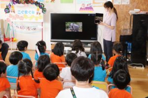 今日はライオン小児矯正歯科のスタッフが来園し、学年ごとに歯磨き指導を行いました。ひよこ組は音楽に合わせて楽しい雰囲気の中、歯磨きをしました。年少組は動物の口や歯を見て「誰の歯クイズ」!自分達と動物の歯の違いに興味津々のこぐま組さんでした♪年中組は、染め出しに挑戦!染め出し液を口に含んだ後にゆすぎ、磨き残しがある歯にはピンク色が残りました。鏡を見ながら「こっちも磨かなきゃ!」と真っ白の歯になることを目指していました。年長組は「乳歯と永久歯の生え変わり・違いを知る」という内容で大人と子どもの歯の違いについて写真を見ながら気づいたことを言葉にして伝え合っていました✨