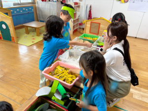 朝の自由活動での出来事です!こぐま組の教室から「いらっしゃいませ~!」と元気な声が聞こえてきました☆最近は室内遊びでハンバーガー屋さんが人気で、なりきってみんなで楽しんでいます♪お客さんが来ると「どんなハンバーガーがいいですか?」とお客さんの注文をよく聞いている様子です・・・☆「チーズいっぱいのハンバーガください!」と注文が入ると、「お待ちください~!」と早速ハンバーガー作りがスタート!店員さんになりきって一生懸命作る姿が、まるで本当の店員さんのようでした😊ハンバーガー作りの材料は、すみれ組さんが参観日の活動で作ってたものを借りています!時々すみれ組さんが様子を見に来て「まずはいらっしゃいませって言うんだよ!」と教えに来てくれます♪これからもお店屋さんごっこを楽しめるような環境を工夫していきたいと思います!