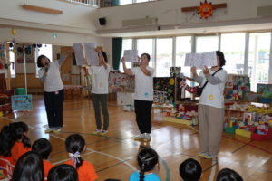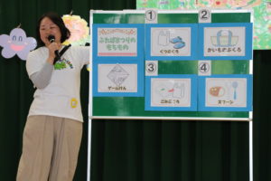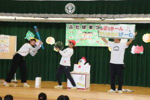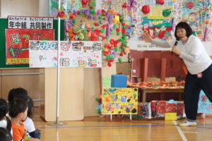 今日はふたばまつりのお楽しみ会でした。お楽しみ会では明日のふたばまつりでの持ち物や服装など、園長先生に教えてもらったことを目をキラキラさせてしっかりと話を聞いていました!その他には共同製作やお買い物コーナー、ゲームコーナーについて先生方から教えてもらい更に期待が膨らんでいる様子でした!!最後に天保先生が明日の持ち物の「ゲーム券」「お家の方の靴袋」「買い物袋」「ゴミ袋」「カレー用スプーン」を伝えてもらい、「忘れ物しないようにお家の方にも教えてあげよう!!」と明日の準備はバッチリ★
