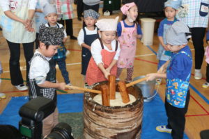 付き手のお父さんがおもちをつくと、だんだんとネバネバになり、もち米がおもちに変化していく様子に興味津々・・!子ども達も「♪おもちつき」のうたを歌ったり、「よいしょ~!」とかけ声を言いながら、みんなでおもちつきを楽しむことができました(^O^)つきたてのおもちはとっても柔らかくて、給食のお雑煮で美味しくいただきました!!おかわりも止まらず大人気☆彡