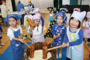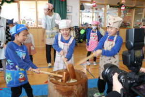 付き手のお父さんがおもちをつくと、だんだんとネバネバになり、もち米がおもちに変化していく様子に興味津々・・!子ども達も「♪おもちつき」のうたを歌ったり、「よいしょ~!」とかけ声を言いながら、みんなでおもちつきを楽しむことができました(^O^)つきたてのおもちはとっても柔らかくて、給食のお雑煮で美味しくいただきました!!おかわりも止まらず大人気☆彡