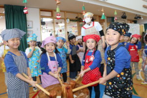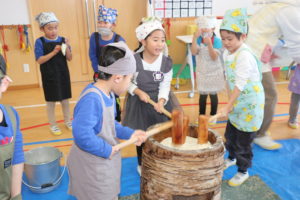 子ども達が楽しみにしていたおもちつき会!!運動場に準備していた大きな臼と杵を見て朝からワクワクしていました♪エプロンと三角巾を身に付け、いよいよおもちつき会のスタートです!