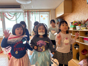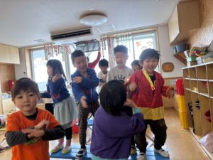今日から冬休みが始まりました✨朝から「○○ちゃん、○○先生おはよう!」と元気に挨拶してくる子ども達!(^^)!園庭に出て、おしり滑りや色水遊びを楽しみ、教室ではダンスパーティーをして楽しく過ごしました。発表会で踊った曲を流すと「あ!」と言い、即自然とカラーベンチの上に立ち、笑顔で踊る様子が微笑ましかったです!!今後も子ども達がやりたい!やってみたい!と思えるような環境作りを工夫していきたいと思います。