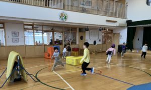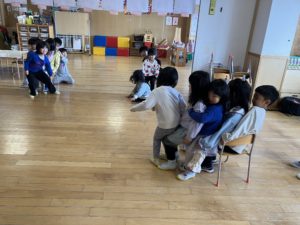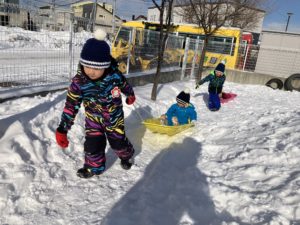 今日は青空が広がり、気持ちの良い天気のもとで園庭遊びを楽しみました。人気があった遊びは『(色水を使った)かき氷屋さん・ケーキ屋さん』などのごっこ遊びや友達をそりに乗せ、平らなところを走ったり、でこぼこ道を引っ張ってあげるそり遊びでした。また、室内では『椅子&おひざ座りゲーム』『〇✕ゲーム』などの集団遊び、運動場で『かくれ鬼』をし、汗をたくさんかきながら全身を使ってのびのびと遊んでいました!お店屋さんごっこでは「お年玉で買います!」と袋から手作りのお金を取り出してやりとりをする姿が微笑ましかったです。クラスや年齢の枠を超えてたくさんの友達と一緒に遊びを楽しめることがホームフレンドサークルならではの楽しみや経験だと思います。明日以降もぜひ遊びに来てくださいね☆