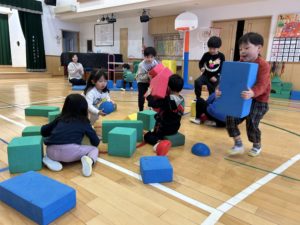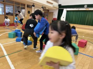 今日は運動場で「お家へ戻そう!ゲーム」を行いました!赤・青・黄色のチームに分かれて、それぞれのお家(マットの上)にスタンバイ!真ん中にあるソフトカラー積木やチクチクボールの中から、自分のチームの色だけを選んでお家まで運ぶゲームです。