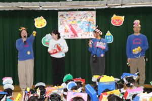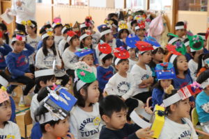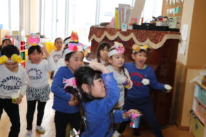 今日は2月3日の節分の日。ふたば幼稚園でも『節分のお楽しみ会』をしました。朝から「鬼が怖いな…」「楽しみ!」「強い気持ちで豆を投げよう!」と様々な気持ちでウキウキ☆ワクワクの子ども達。お楽しみ会の中で、他クラスの鬼のお面を紹介すると、自分なりに創意工夫した手跡がたくさんの個性的な作品が勢揃い☆また、先生方の劇を見て大興奮でした❤その後、赤鬼と青鬼が教室にやってくると…表情が強張っている子、窓際に後ずさりする子がいる中で、涙を流して顔をくしゃくしゃにしながらも果敢に豆を投げている子が多かったです。給食では恵方巻を自分で作り、今年の恵方(南南東)を向いて食べました。「泣き虫鬼」「食べ過ぎ鬼」「怒りんぼ鬼」「ケンカする鬼」「文句を言う鬼」など自分の心の中にいる鬼を退治して、どの子もすっきりと晴れ晴れした表情で今日一日を楽しく過ごすことができました♪