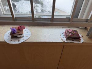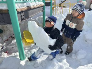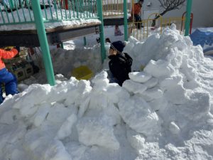 自由活動中、園庭では連日の大雪で高くなった雪山がスリル満点!スピードが出たり、ジャンプ台のようになっていて、ソリやお尻滑り座布団で滑る楽しさが倍増し、ダイナミックに遊んでいます。その他、雪をバケツに詰めて型抜きしたものを重ねてお城つくりやふたばランドの下では集めた雪の塊を積み上げておうちつくりに夢中になったり・・・。思い思いに雪遊びを満喫中です。室内ではバレンタインのチョコやケーキつくりが盛り上がっています。みんなで色を塗った段ボールをハート💕や四角、丸く切って、ビーズや毛糸、花紙などでトッピング!「おいしそう」と思わず食べたくなるような出来栄えでエントランスホールに飾っています。今後も季節ならではの遊びを十分に楽しめるよう環境を工夫していきたいと思います。
