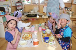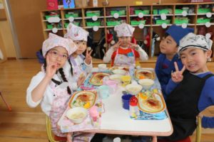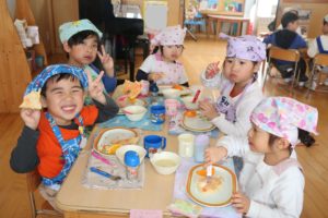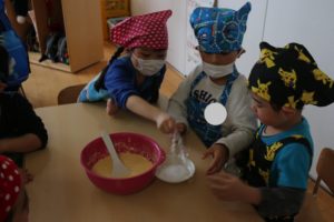 年少組・年中組・年長組は待ちに待ったクッキング♬今日は、縦割りのグループを作り、いろいろな教室に移動してクッキングをしました。まずは、作り方の手順を確認!「小麦粉とか卵とか入れるんでしょ!?」とこれまでの経験を振り返ったり、「なんとかパウダーもだよね…なんだったっけ…?」と子ども達にとって馴染みのない材料(ベーキングパウダーのことです笑)を使うことも知り、新たな発見を楽しみながら友達と力を合わせて材料を混ぜていきます★生地が滑らかになっていき、いざホットプレートの上へ…!!やけどに気を付けながら、自分の食べたい分量を注ぎ、ひっくり返すのも子ども達。美味しそうなにおいであふれる教室内は「早く食べたいなぁ!!」とワクワクでいっぱいの様子でした。出来上がったパンケーキを口に入れると、思わず満面の笑みがこぼれます😊「ふわふわしてる」「美味しい」等、友達と伝え合う姿が印象的でした😋食後も、それぞれの教室では集団遊び等をし、触れ合いを楽しみました✨友達同士で教え合ったり助け合ったり、年長さんの頼もしさに憧れを感じたり…普段の生活では味わえない充実した一日になったように感じます🎵