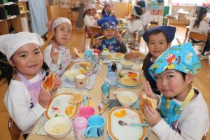 年少組・年中組・年長組は待ちに待ったクッキング♬今日は、縦割りのグループを作り、いろいろな教室に移動してクッキングをしました。まずは、作り方の手順を確認!「小麦粉とか卵とか入れるんでしょ!?」とこれまでの経験を振り返ったり、「なんとかパウダーもだよね…なんだったっけ…?」と子ども達にとって馴染みのない材料(ベーキングパウダーのことです笑)を使うことも知り、新たな発見を楽しみながら友達と力を合わせて材料を混ぜていきます★生地が滑らかになっていき、いざホットプレートの上へ…!!やけどに気を付けながら、自分の食べたい分量を注ぎ、ひっくり返すのも子ども達。美味しそうなにおいであふれる教室内は「早く食べたいなぁ!!」とワクワクでいっぱいの様子でした。出来上がったパンケーキを口に入れると、思わず満面の笑みがこぼれます😊「ふわふわしてる」「美味しい」等、友達と伝え合う姿が印象的でした😋食後も、それぞれの教室では集団遊び等をし、触れ合いを楽しみました✨友達同士で教え合ったり助け合ったり、年長さんの頼もしさに憧れを感じたり…普段の生活では味わえない充実した一日になったように感じます🎵
