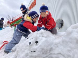 ここ数日、気温が高くなり園庭の景色も一変しています。雪山が小さくなったりあおぞらランドの雪も少なくなったり…子ども達は気温や雪質の変化に気付いていて、その中で楽しさを見つけ出す天才です!園庭を走り回ったり、雪山の斜面にかまくらを作ったりと元気いっぱい☆今日は玄関近くの雪の下から泥が出てきていたのですが、それをスコップで集めて白い雪と混ぜ『チョコレートアイス作り』や砂を混ぜた実験などを楽しんでいました。しかし、気温の変化と共に少し寂しいことも…みんなが大切にしてきた『ふたばちゃん雪像』が、溶けて小さくなり形が崩れてきているのです。それに気付いた年中組の子ども達が「ふたばちゃんをきれいにしよう!」と、雪像の修復を始めていました。スコップで直そうとしている友達に気付き「壊れやすいから、手で優しくした方がいいよ~。」とアドバイスをしている姿に優しさを感じました♡春はもうすぐそこまできています。残りわずかな雪遊びも楽しめるように子ども達と更に工夫していきたいと思います!