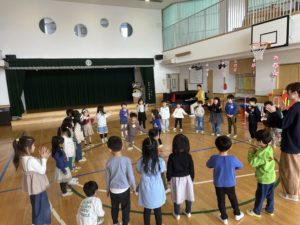今日も幼稚園は、ホームフレンドサークルに遊びに来ている子ども達で賑やかです🌼運動場ではみんなで「♪誕生月なかま」を楽しみました!輪になって手を繋ぐ場面では、「一人が先に進むとバラバラになってしまう」ということに気が付いた子ども達。「みんなで一緒に歩いて揃えよう!」と話し合ったり、年上の子が小さいお友達の手を握りリードする様子から、異年齢のかかわりの中で”みんなで楽しむ”姿が広がっていました✨その後は運動場にブルーシートを広げて、まるで本当のピクニックをしているような雰囲気の中でお弁当の時間を楽しみ、友達同士で「卵焼き入ってる人~?」などやりとりをしながら、笑顔いっぱいのひとときを過ごしました💗