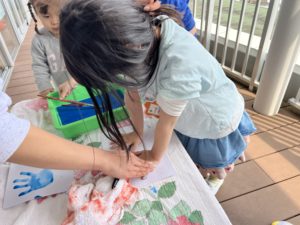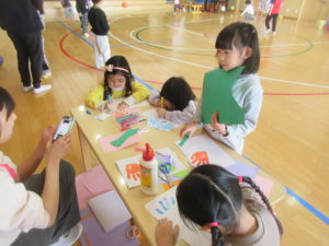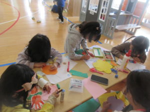 少しずつ温かくなってきて、「もうすぐお花が咲くね」の教師の一言から「みんなでお花を作ってみようよ!」と盛り上がっていた子ども達。絵の具で手形を押してその周りを切って葉っぱに見立たり、画用紙でお花を切り貼りして自分だけの”お花”を作っていました。その後は完成した”お花”にパステルで絵を描いたり、色を塗って更に素敵に仕上げていました★出来上がった作品はエントランスホールのボードに掲示していますので、春の季節を感じていただけたら …と思います!