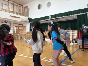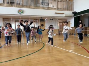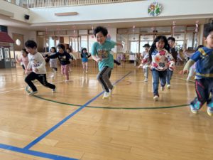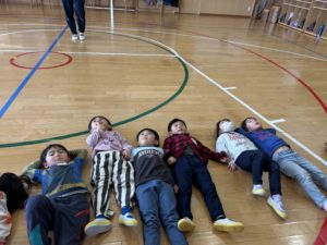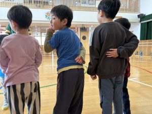 今日のホームフレンドサークルでは〈いろいろなリレー〉を楽しみました。お題に合わせて子ども達が変身をし、ゴールを目指すというルールです。お題は子ども達に決めてもらいました。ジャンプ・スキップ・上向き歩き・おじいさん・ラッコの中で特に面白いと感じたのはおじいさんの変身です。手を腰に当て、中腰になりゆっくり歩く子ども達…(笑)イメージを広げ表現することを楽しんでいる様子でした。友達と一緒に遊ぶことで新たな表現を考えたり、面白さを感じたり、表現することの楽しさを十分に感じられるきっかけとなるので今後も楽しい遊びを計画していきたいです✨