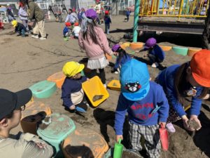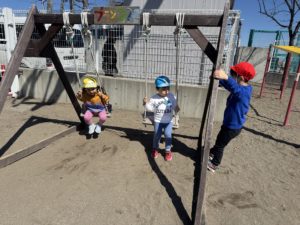 今日はお天気☀が良かったので、自由活動後も全クラス園庭で遊びました☆ポカポカ陽気の中、バケツに汲んだお水をすくって、泥んこ遊びやおままごと、砂場でお山作りに夢中になったり、滑り台やブランコでのびのびと体を動かし思い思いに楽しんでいました♪「ひよこ組🐤」の子ども達も、お兄さん、お姉さんの遊びや様子に興味津々👀真似をしたり、仲間に入って遊んでいました。ひよこ組の子ども達も明日から独り立ちしての登園が始まります。これからも幼稚園で過ごす居心地の良さや楽しさを存分に味わい笑顔で元気いっぱい過ごせるようかかわっていきたいです!